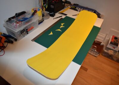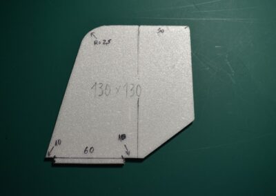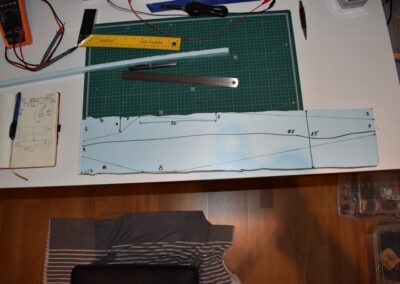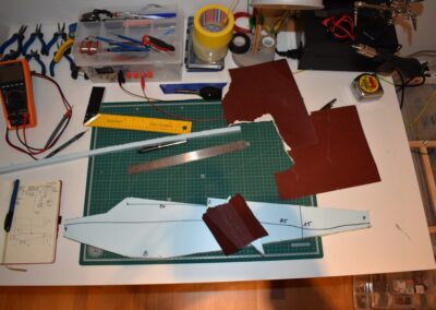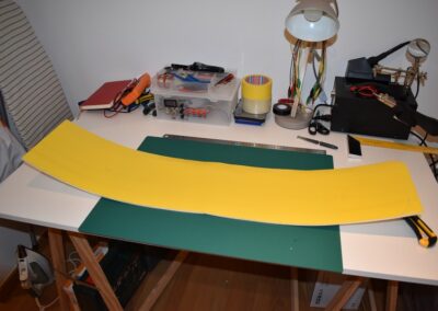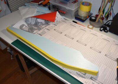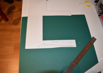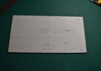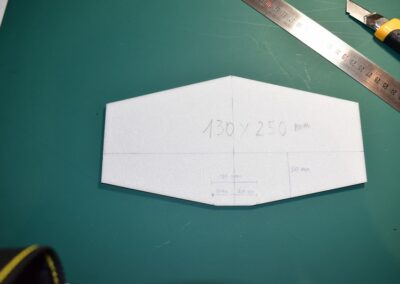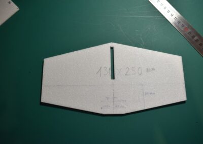 - Sobre el rectángulo, cortado, dibujamos el perímetro del fuselaje, lo cortamos y lo lijamos, las dimensiones de corte se pueden ver en las fotos o en el diseño CAD.