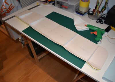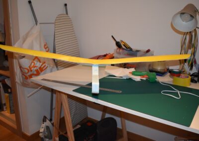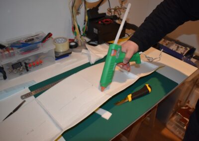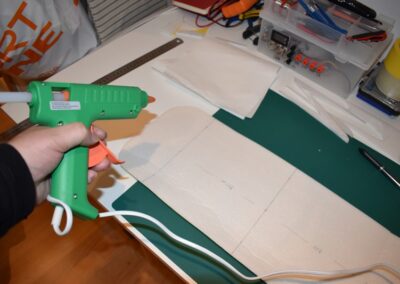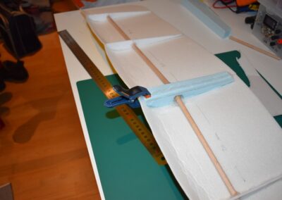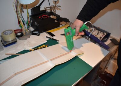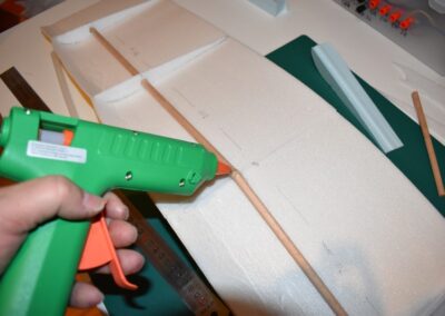 - Ahora vamos a pegar las costillas de 4 mm al ala, para ello, donde marcamos echamos una tira generosa de pegamento caliente con la pistola y a continuación colocamos el perfil y presionamos el ala hacia el hasta que seque el pegamento asegurándonos que el ala coja la forma de dicho perfil. En las fotografías se puede ver como yo lo hice.