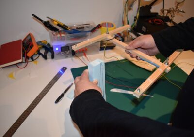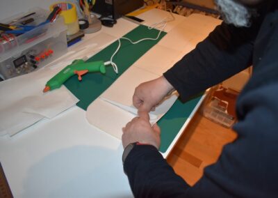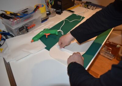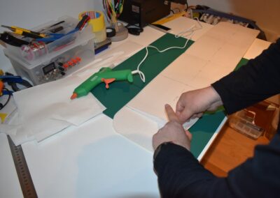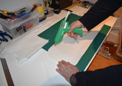 - A continuación, echamos pegamento en la unión de las dos piezas del ala y lo extenderemos para fijar la unión y nos quede con el ángulo que deseamos.
