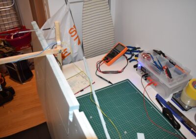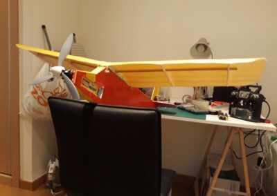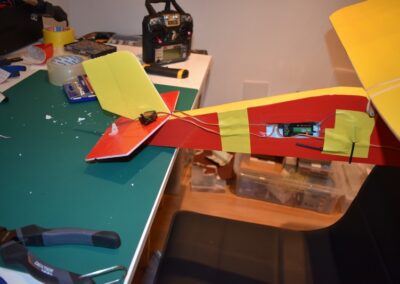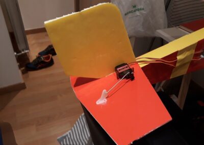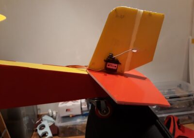- Colocamos los servos en los estabilizadores horizontal y vertical, para ello, en la parte móvil del estabilizador pegamos un soporte al cual uniremos un alambre de 0.7 mm que por el otro lado estará unido al servo el cual le dará movimiento. En el punto, del estabilizador, que la parte móvil del estabilizador este alineada y el alambre este tenso pegamos el servo. Véanse fotografías.