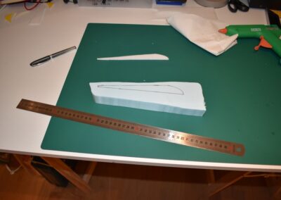 - Nos ponemos con el perfil alar, lo diseñamos sobre el poli estireno de 4 mm y posteriormente lo recortamos. Con esta plantilla vamos hacer otros 3 de 4 mm y uno de 3 cm de espesor para el centro del ala, estos recortes serán las costillas del ala y harán que tenga la forma del perfil alar.
