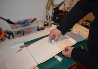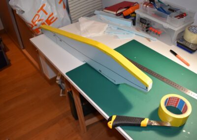 - Ayudándonos de unos objetos para formar una altura de 8 cm aproximadamente, y poniendo el centro del ala sobre ellos con las puntas apoyadas en la mesa, formaremos un ángulo de, más o menos, 9º, ángulo que nos dará más sustentación en el aire. Al inclinar las alas, donde tenemos la curva del perfil alar, se nos va abrir una pequeña cuña, para la cual cortaremos su forma en el poli estireno de 4 mm, la colocaremos en el hueco y la pegaremos, esto hará que el ángulo se mantenga.