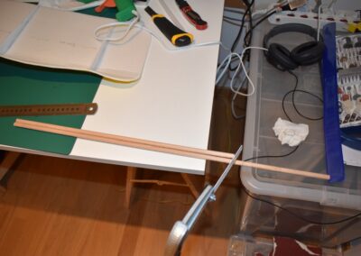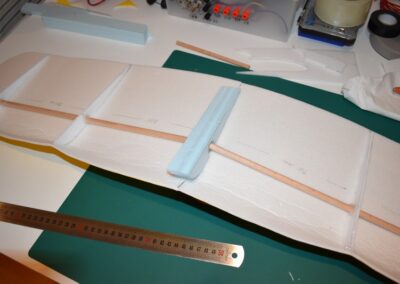 - Ahora cortaremos dos listones redondos de Ø1cm y de 42 cm de largo, para reforzar el ala longitudinalmente, colocándolos y pegándolos paralelos a 6 cm, (30% de la cuerda del ala). del borde de ataque en la parte inferior del ala como se muestra en las fotos. Este listón lo tendremos de referencia para equilibrar el avión una vez esté acabado totalmente.