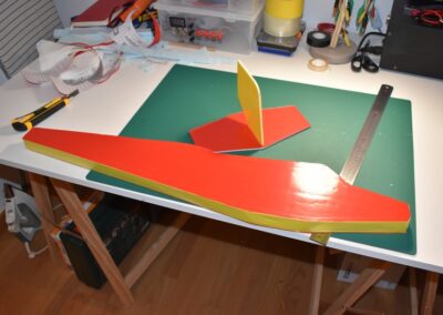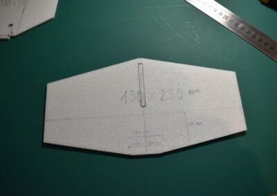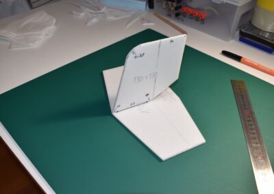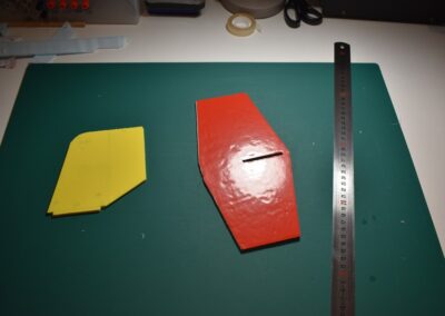 - Sobre el poli estireno de 4 mm marcamos y cortamos el estabilizador horizontal y el estabilizador vertical, las dimensiones se pueden ver en las fotos.