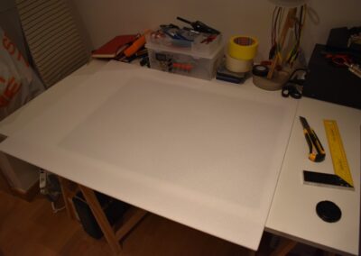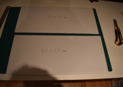 - Ahora tomamos una plancha de poli estireno, de 4 mm de espesor, para hacer las alas, para lo cual, cortamos dos rectángulos de 50 x 22 cm.