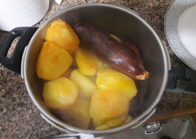 - Una media hora antes de acabar de cocer las Androias, echamos las patatas cortadas en trozos y comprobamos la sal del agua de la cocción y si es necesario le añadimos más.