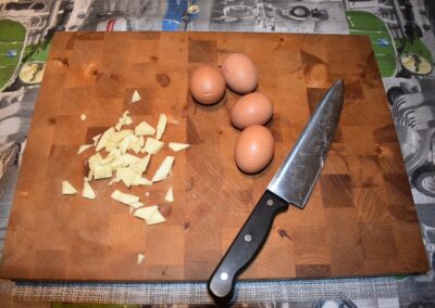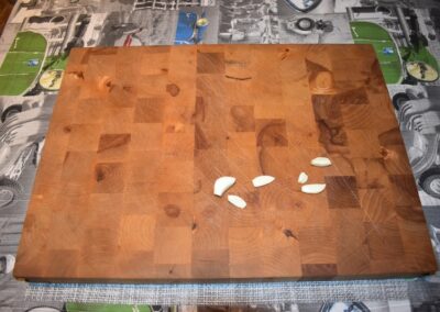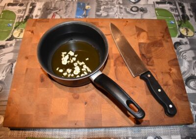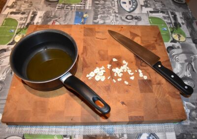 - Picamos el Ajo y lo echamos, sobre el aceite, dentro de la Cazuela.