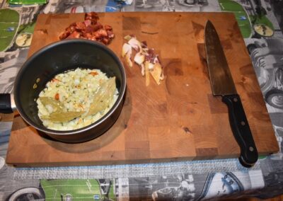 - Una vez Dorados los Ajos, añadimos las guindillas de Cayena, La cebolla Picada y el Laurel y removemos.