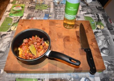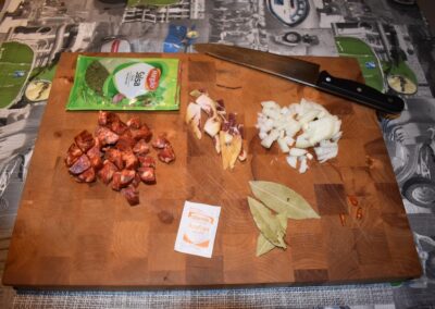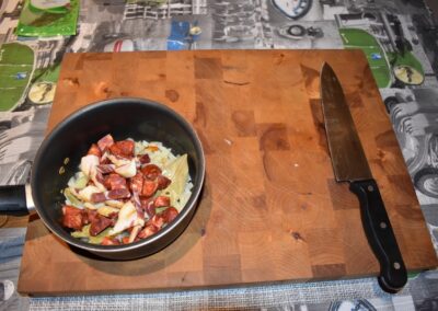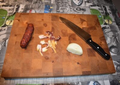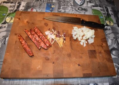 - Picamos la cebolla, el chorizo y el Jamón antes de encender el fuego para tenerlos preparados, si no, es posible que el ajo se nos queme.
