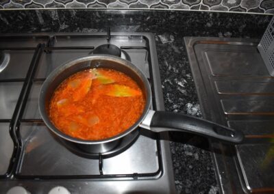 - Reducimos el fuego al mínimo y revolvemos, si es necesario iremos echando pequeñas cantidades de Agua caliente.