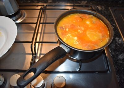 - Ahora ya no revolvemos, simplemente movemos la tartera para que con su peso los huevos se hundan en el líquido superficial.