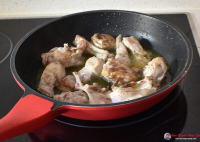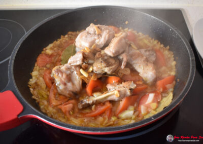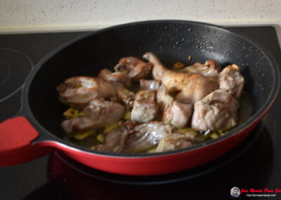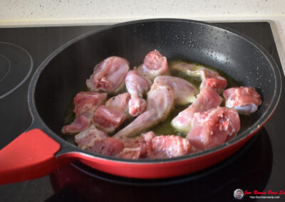 - Incorporamos el conejo y lo freímos hasta que empiece a dorarse por fuera.