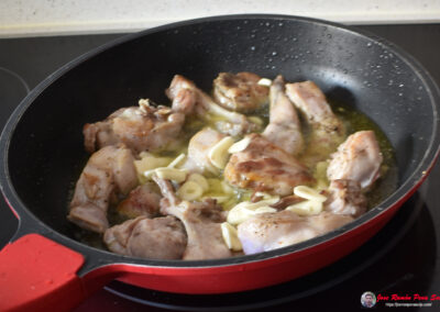 - Cuando el conejo esté dorado, añadimos los ajos y dejamos que se frían junto a la carne.