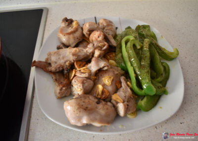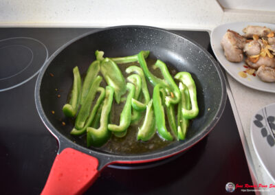 - Cortamos los pimientos en tiras mientras se doran los ajos.