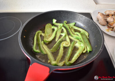- En el mismo aceite, añadimos las tiras de pimiento y las freímos hasta que estén tiernas.