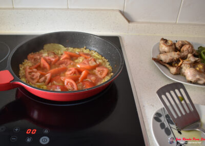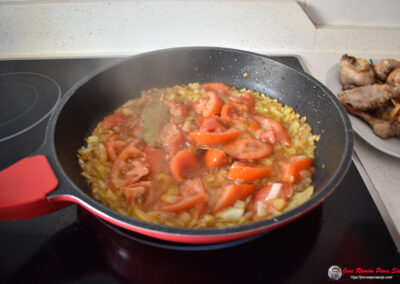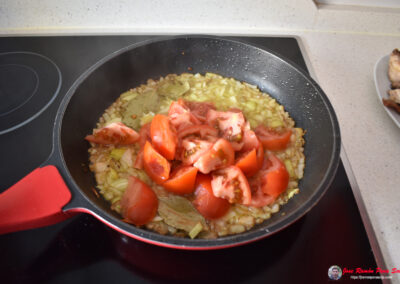 - Cuando la cebolla esté pochada, añadimos el tomate y lo dejamos sofreír con todo.