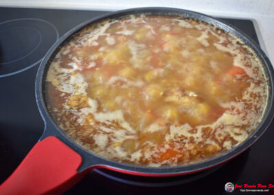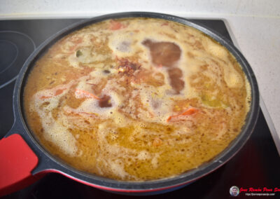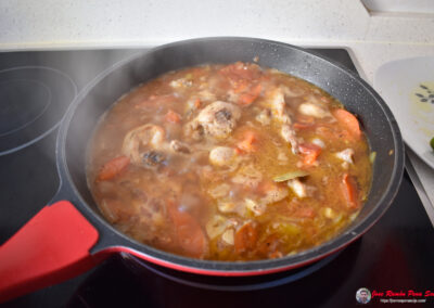 - Añadimos agua hasta cubrir toda la mezcla y dejamos cocinar unos 30 minutos a fuego medio, para que el conejo se ablande y el líquido se reduzca poco a poco.