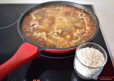 - Pasado ese tiempo, añadimos más agua: unas tres veces la cantidad de arroz si queremos un arroz meloso, o solo el doble si preferimos que quede más seco.
