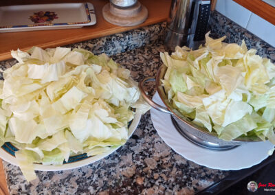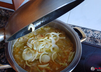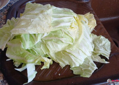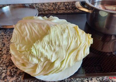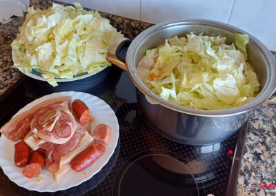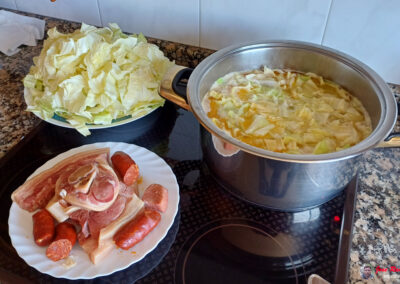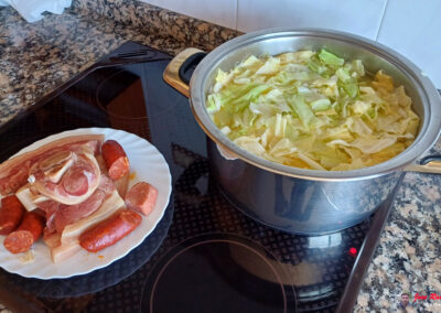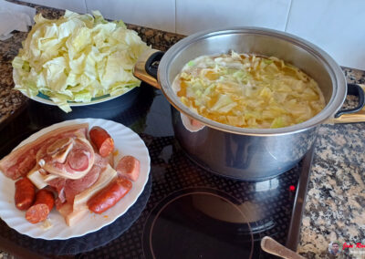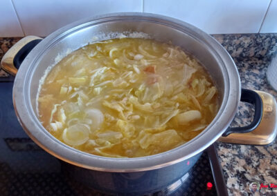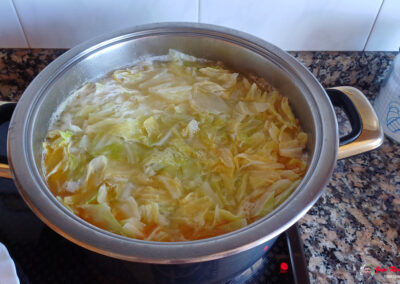 - Una vez que vuelva a hervir, echamos el repollo cortado en trozos, en varias tandas si es necesario.