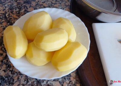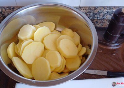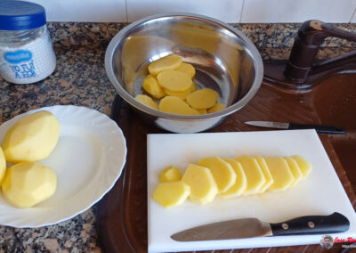 - Pelamos y cortamos las patatas, en este caso, en láminas. También se pueden cortar en trozos pequeños y chascarlas para que suelten más fécula en el caldo al cocer y este se haga más denso desde el principio.