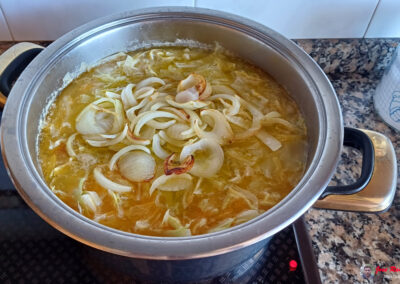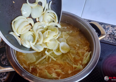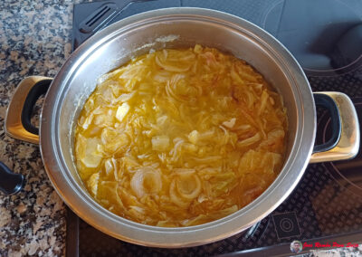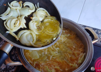 - Una vez pochada la cebolla, vertemos el contenido de la sartén en la olla.