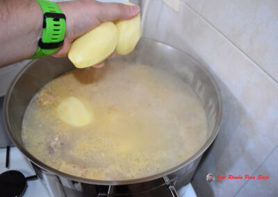 7. Media hora antes de apagar el fuego, añadimos las patatas a la pota. Si las patatas son nuevas, podemos cocerlas sin pelar.