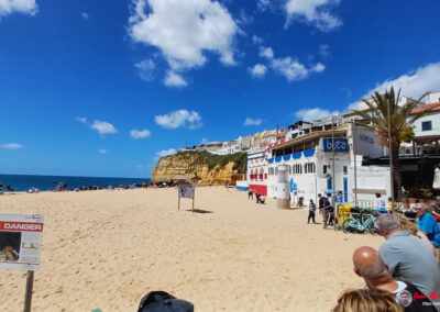 La playa de Carvoeiro es el corazón del pueblo, enmarcada por acantilados dorados y aguas cristalinas. Es perfecta para nadar, tomar el sol y explorar las cuevas marinas cercanas en kayak o en bote. La playa está bien equipada con instalaciones y tiene una variedad de bares y restaurantes cercanos donde puedes degustar mariscos frescos.