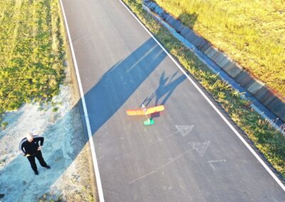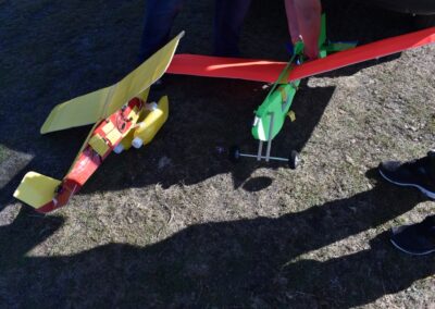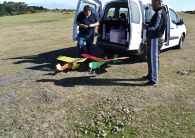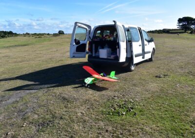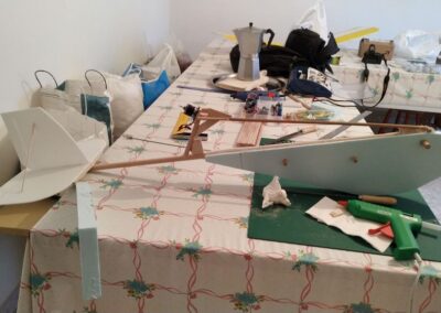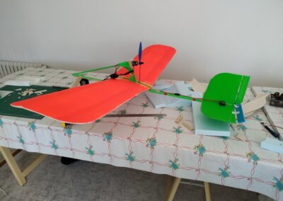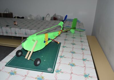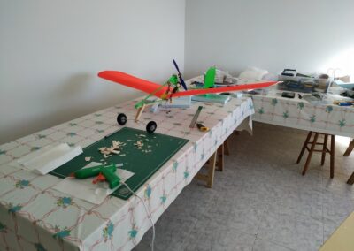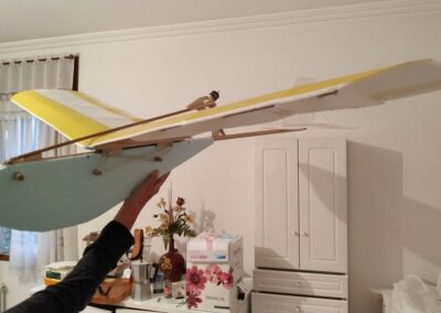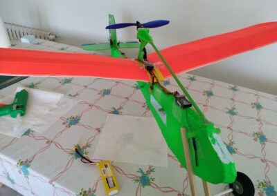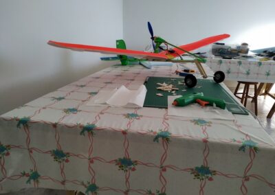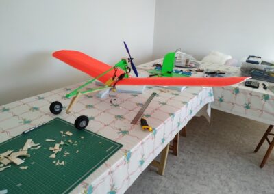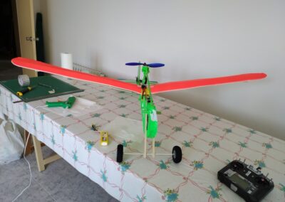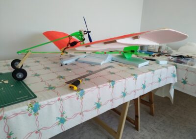 Después de la primera prueba de vuelo, lo destrocé y lo rehíce sin fuselaje, además le reduje el ángulo del motor con respecto al fuselaje a unos 10 grados, por eso, veréis fotos del avión sin él, la verdad es que así y sin tren de aterrizaje fui capaz de volarlo, hasta que ya se destrozó definitivamente.
