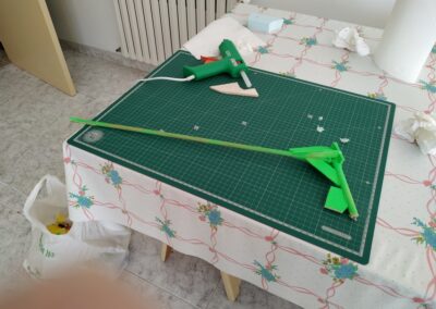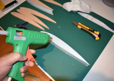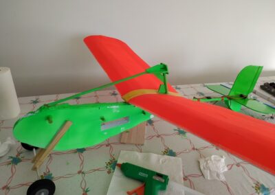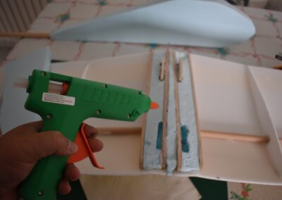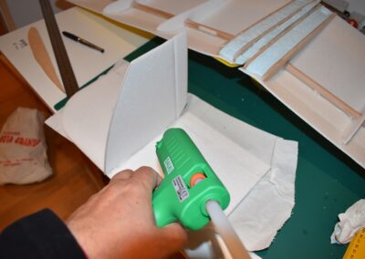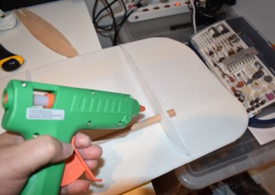 11. A continuación, echamos pegamento en la unión de las dos piezas del ala y lo extenderemos para fijar la unión y nos quede con el ángulo que deseamos.