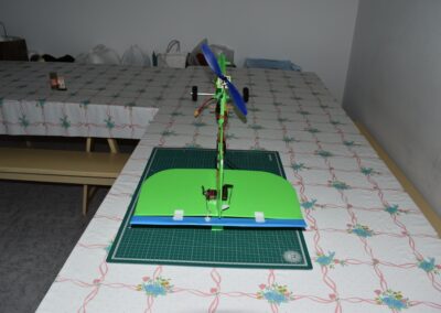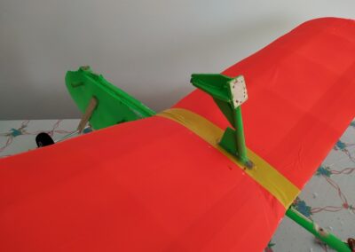 2. Colocamos los servos en los estabilizadores horizontal y vertical, para ello, en la parte móvil del estabilizador pegamos un soporte al cual uniremos un alambre de 0.7 mm que por el otro lado estará unido al servo el cual le dará movimiento. En el punto, del estabilizador, que la parte móvil del estabilizador este alineada y el alambre este tenso pegamos el servo. Véanse fotografías.