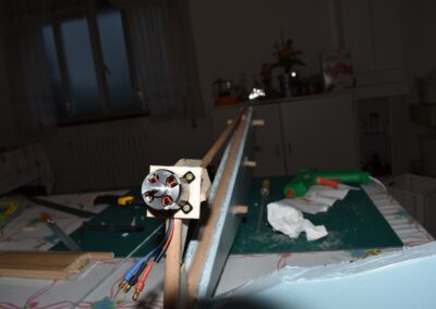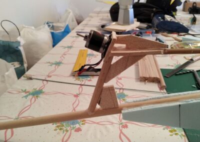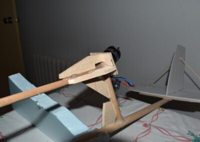 23. Por último, nos queda por hacer una estructura, en madera, para colocar el motor en la parte trasera del ala, en las fotos podéis ver la que yo he hecho, el eje del motor esta a unos 10 cm. de altura sobre el fuselaje y el ángulo es de unos 20 grados apuntando hacia abajo.