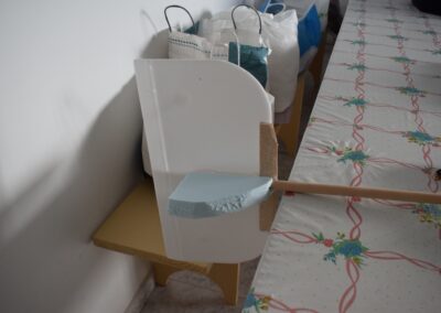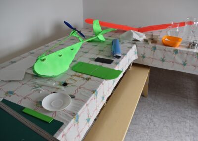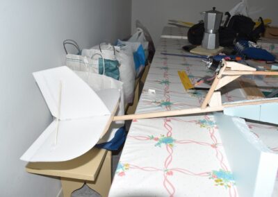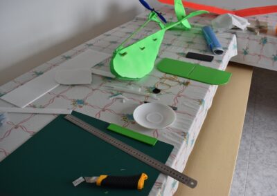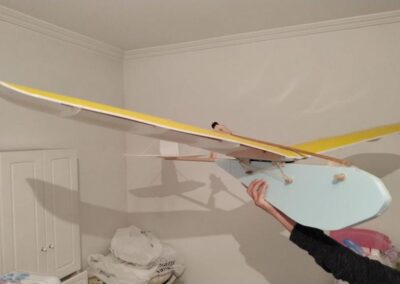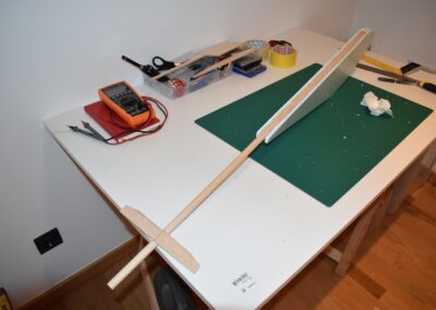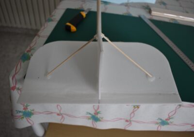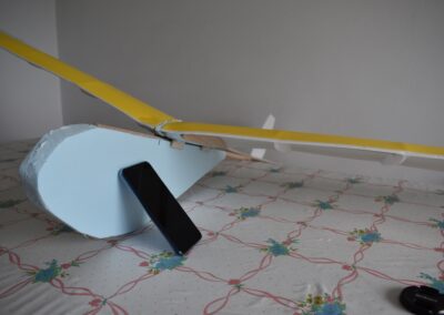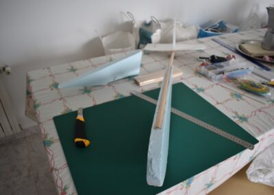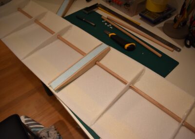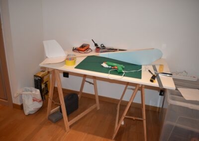 10. Ayudándonos de unos objetos para formar una altura de 13 cm aproximadamente, y poniendo el centro del ala sobre ellos con las puntas apoyadas en la mesa, formaremos un ángulo de, más o menos, 9º, ángulo que nos dará más sustentación en el aire. Al inclinar las alas, donde tenemos la curva del perfil alar, se nos va abrir una pequeña cuña, para la cual cortaremos su forma en el poli estireno de 4 mm, la colocaremos en el hueco y la pegaremos, esto hará que el ángulo se mantenga.