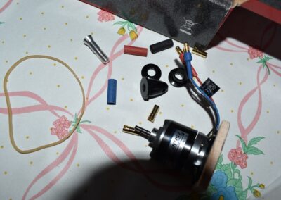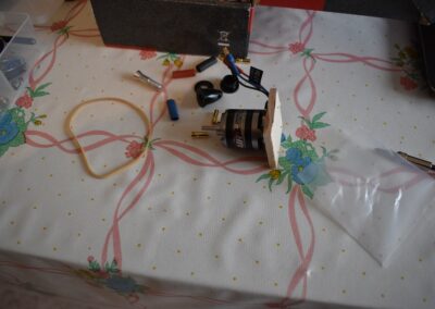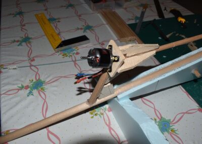 1. Unimos el motor al soporte de madera hecho sobre el fuselaje, con pegamento, intentando que, más o menos, el motor cabecee hacia abajo con el ángulo, indicado anteriormente, de 20 grados.