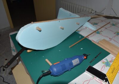 22. Ahora colocaremos dos piezas a las que sujetaremos el ala con gomas elásticas, para ello tomamos el listón redondo de madera de Ø1cm y cortamos dos trozos de 6 cm. A continuación, perforamos el fuselaje en dos sitios, uno debajo del borde de ataque y otro debajo del borde de salida del ala, dejando por lo menos 1 cm de resguardo, entre el perímetro del fuselaje y el borde del listón, para que no rompa. Una vez introducido y centrado el listón lo pegamos.