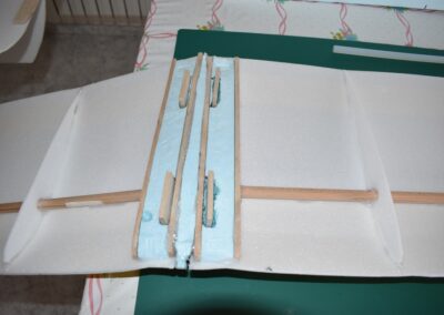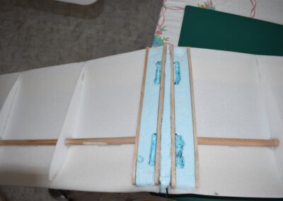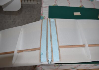 12. Con el porexpan de 3 cm. de espesor y dos planchas de madera de balsa hacemos un refuerzo para el centro de las alas con la forma del perfil alar y lo pegamos, esto irá en contacto con el fuselaje.