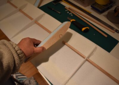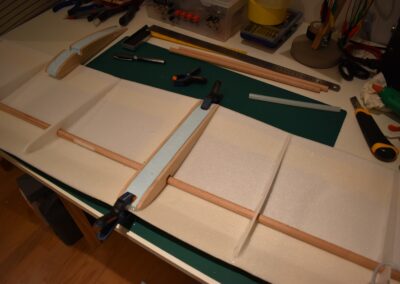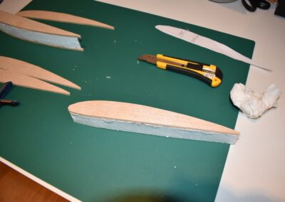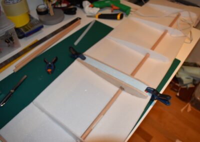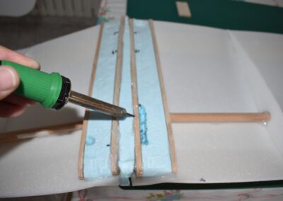 9. Ahora vamos a pegar las costillas de 4 mm al ala, para ello, donde marcamos echamos una tira generosa de pegamento caliente con la pistola y a continuación colocamos el perfil y presionamos el ala hacia el hasta que seque el pegamento asegurándonos que el ala coja la forma de dicho perfil. En las fotografías se puede ver como yo lo hice.