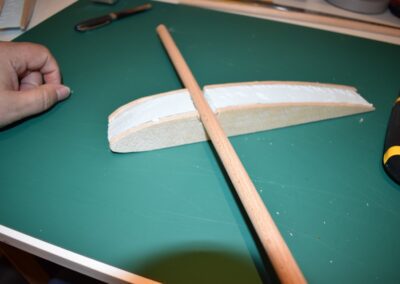 13. Ahora cortaremos dos listones redondos de Ø1cm y de 62 cm de largo, para reforzar el ala longitudinalmente, colocándolos y pegándolos paralelos a 9 cm, (30% de la cuerda del ala). del borde de ataque en la parte inferior del ala como se muestra en las fotos. Este listón lo tendremos de referencia para equilibrar el avión una vez esté acabado totalmente.