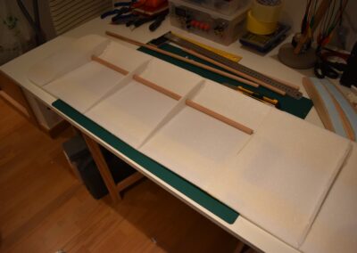 8. En la parte inferior del ala marcamos donde vamos a colocar las costillas, haremos desde el centro dos líneas paralelas hacia cada lado, la primera a 20 cm., la segunda a 40 cm. y la tercera a 60 cm.