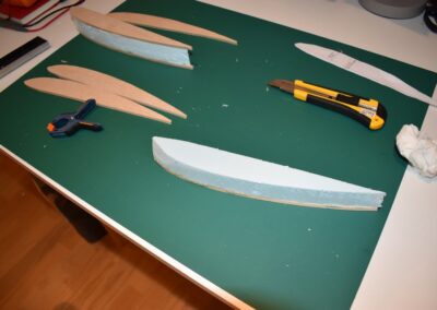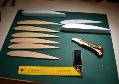 7. Nos ponemos con el perfil alar, lo diseñamos sobre el poli estireno de 4 mm y posteriormente lo recortamos. Con esta plantilla haremos otras 5 unidades, estos recortes serán las costillas del ala y harán que tenga la forma del perfil alar.