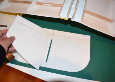 19. En los estabilizadores vertical y horizontal hacemos un corte, poco profundo, sin llegarlos a separar, en el lugar donde va a girar la parte móvil de dichos estabilizadores, a 3 cm de la parte final, ver diseño. La parte móvil quedará sujeta y hará bisagra con el otro lateral del poli estireno y la cinta o lamina adhesiva. En la zona de corte, cortaremos un ángulo de 45º, a ambos lados del corte, para darle más movilidad. Otra forma de hacerlo es colocar unas bisagras en las partes móviles.