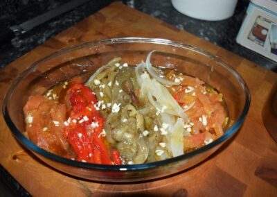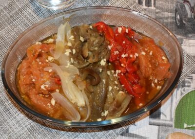 La escalivada es un plato tradicional de la cocina catalana, famoso por ser sencillo pero lleno de sabor. Consiste en una mezcla de verduras asadas al fuego o al horno, principalmente pimientos rojos, berenjenas, y a veces cebolla y tomate. Tras asarlas, se pelan las verduras para quitarles la piel quemada, se desmenuzan en tiras largas y se aliñan con aceite de oliva, ajo, y a veces vinagre.