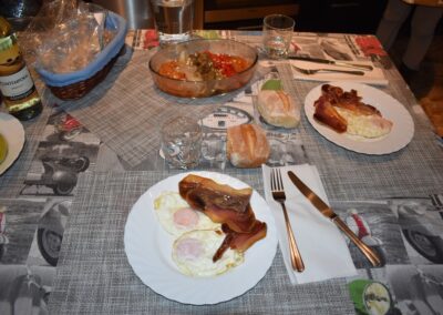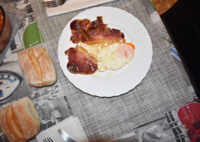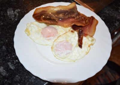 - Para terminar este menú, solo nos falta freír unos huevos en abundante aceite y pasar unas lonchas de Jamón serrano por la plancha.
