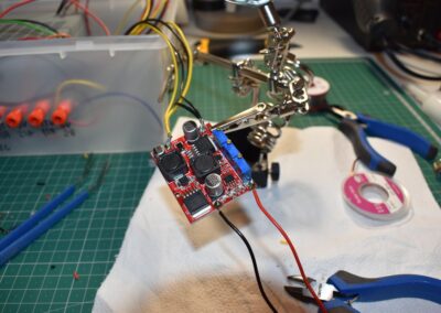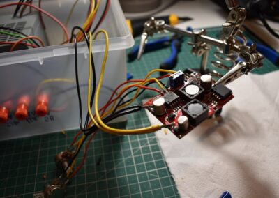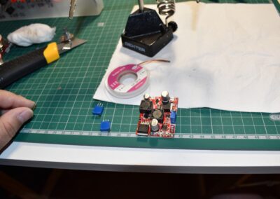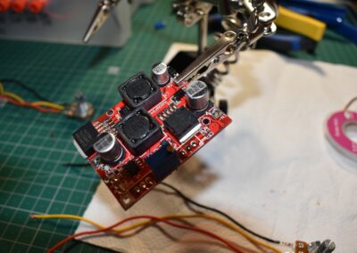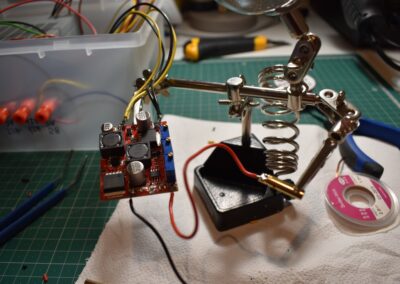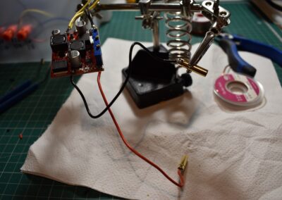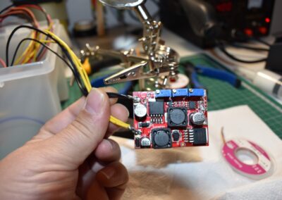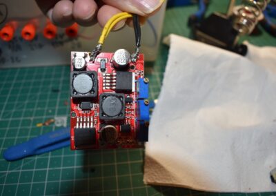 - Ahora tenemos que soldar otros dos cables a la salida del convertidor, uno en el pin que pone “out +” y otro al “out – “, positivo y negativo respectivamente. En el otro extremo cable soldaremos unos conectores de banana hembra a los cuales, una vez terminado, enchufaremos el equipo al cual de queremos dar corriente.