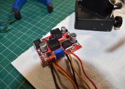 - En el convertidor de voltaje tenemos dos pines, “in +” e “in –“, a los cuales tendremos que soldar los cables amarillos, en mi caso de 12 voltios, al positivo y los negros, tierra, al negativo. Posteriormente lo modificaré y en lugar de soldarlos a los pines del convertidor los soldare a un cable único, de más sección, el cual si soldaré al convertidor. Además, en el cable de positivo le pondré un interruptor.