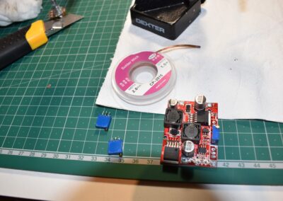 - Lo primero que hago es coger el convertidor de voltaje y quitarle dos de los tres potenciómetros de 10K que trae instalados. Estos potenciómetros, que tendríamos que regular con ayuda de un destornillador, los vamos sustituir por otros dos, también de 10K y que podremos regular manualmente. Para retirarlos, con ayuda del estañador y más estaño, fundimos la soldadura que trae y tirando de ellos deberían salir.