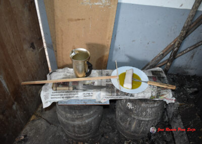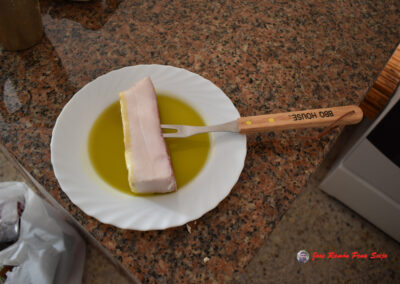 - Cubro el fondo de un plato con aceite de oliva, donde mojaré un trozo de tocino ibérico, con el cual engrasaré la piedra, cada vez que vaya a hacer una tanda de Freixos.
