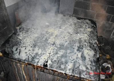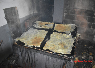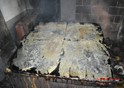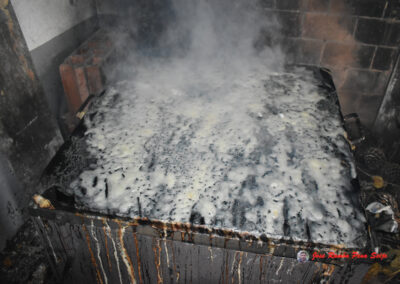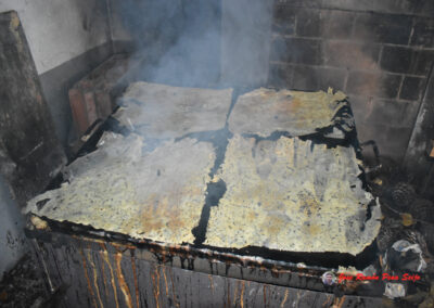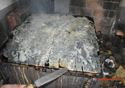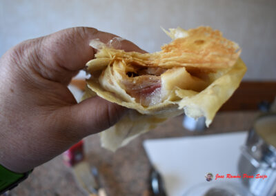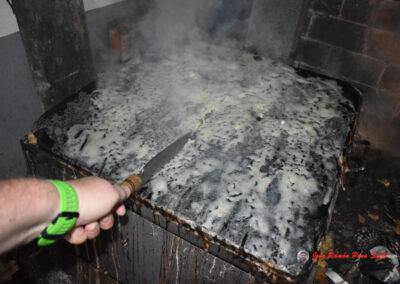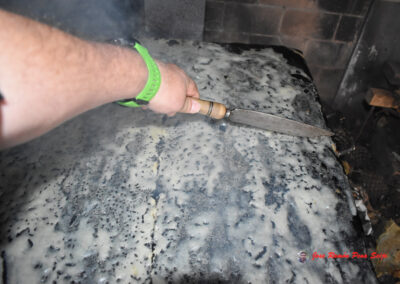- Cuando veamos que están tostados, les damos la vuelta, cogiéndolos por las dos esquinas superiores, ayudándonos de un cuchillo largo, para no quemarnos los dedos, tengo a mano un recipiente con agua, donde mojo los dedos antes de echar mano al freixo.