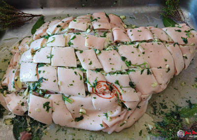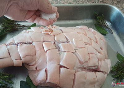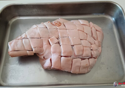 - Realiza cortes longitudinales y transversales en la piel, formando cuadrados de aproximadamente 2 o 3 cm de lado. Esto permitirá que se tuesten durante el horneado, logrando un bocado especialmente suculento.