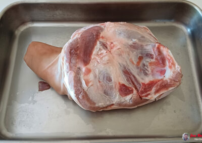 - Introduce la bandeja en el horno, con el lacón cubierto con papel de aluminio. Hornea a 180 grados, con calor por arriba y por abajo, durante unas cuatro horas. Este tiempo puede variar dependiendo del horno, así que es importante controlarlo.