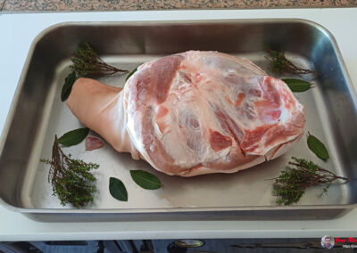 - Coloca el lacón en la bandeja donde lo hornearás. Añade algunas hojas de laurel y ramas de tomillo alrededor.